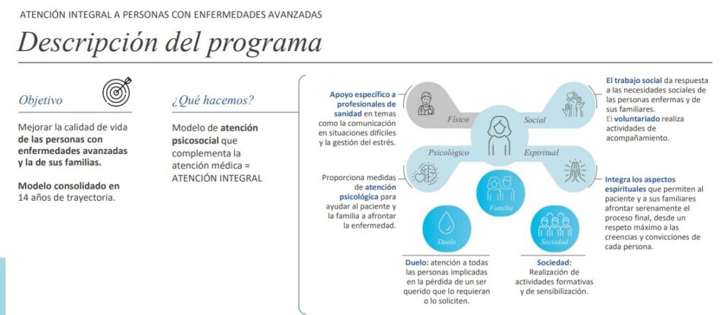 El principal objetivo del programa es proporcionar apoyo emocional, social y espiritual a las personas con enfermedades avanzadas para contribuir a la mejora de su calidad de vida.