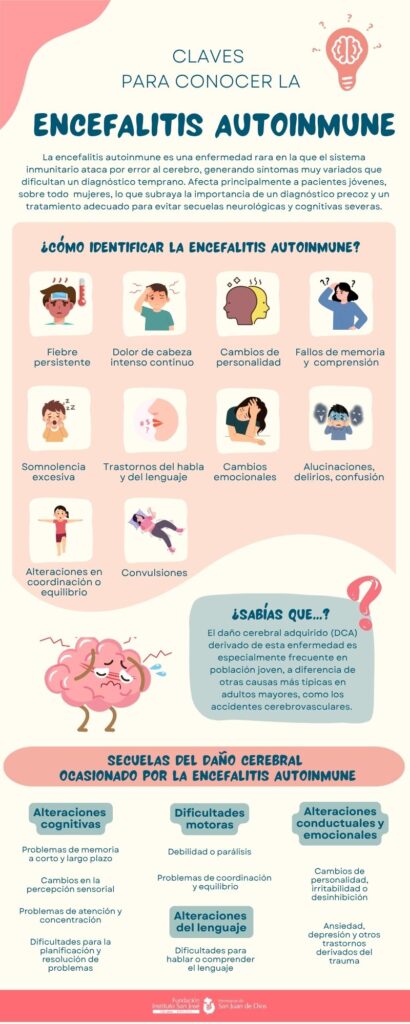 La encefalitis autoinmune está ganando visibilidad como una de las principales causas de daño cerebral adquirido (DCA) en personas jóvenes. Se presenta sobre todo en mujeres con una edad media de 21 años, y ocurre cuando el propio sistema inmunitario ataca por error al cerebro, provocando una inflamación que puede dejar secuelas neurológicas importantes.