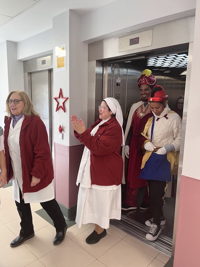 La llegada de los Reyes Magos, junto a sus pajes, en el helicóptero de la Policía Nacional fue uno de los momentos más especiales del día. Tras su espectacular aterrizaje, saludaron a los presentes, para dirigirse a celebrar la especial eucaristía con motivo de la Epifanía del Señor, que tuvo lugar en nuestro salón de actos. Una celebración cargada de significado, cercanía y esperanza.